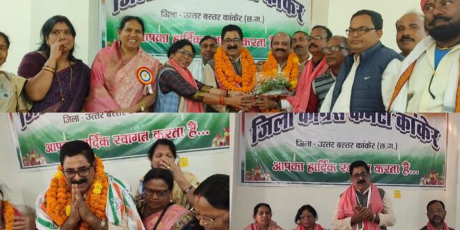 कांकेर 7 दिसंबर 2025:- जिला कांग्रेस कमेटी के नव नियुक्त अध्यक्ष बसंत यादव ने अपना पदभार ग्रहण किया। उनके पदग्रहण को लेकर पूरे जिले में कांग्रेस कार्यकर्ताओं में बड़ा उत्साह देखने को मिला। जैसे ही बसंत यादव कांकेर पहुंचे, कार्यकर्ताओं ने जगह-जगह फूल-मालाओं और नारों के साथ उनका भव्य स्वागत किया। विभिन्न स्थानों पर कार्यकर्ताओं की बड़ी भीड़ उनके स्वागत के लिए खड़ी दिखाई दी, जिससे पूरे जिले में उत्सव जैसा माहौल बन गया।