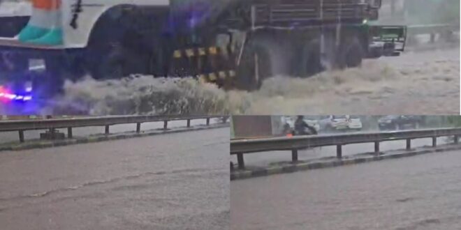 चारामा 11 अक्टूबर 2025:- कल रात से लगातार हो रही तेज बारिश ने चारामा नगर का जनजीवन अस्त-व्यस्त कर दिया है। नगर से होकर गुजरने वाला नेशनल हाइवे-30 बारिश के पानी से पूरी तरह लबालब हो गया, जिससे सड़क तालाब जैसी दिखने लगी। हाइवे से सटी दुकानों में पानी घुस गया, जिससे व्यापारियों का सामान भीग गया और भारी नुकसान हुआ।