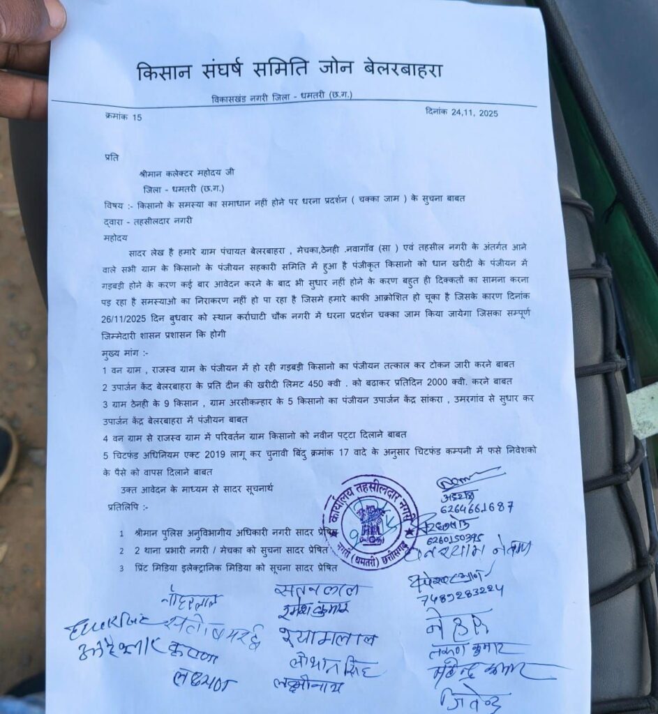 ग्राम पंचायत बेलरबाहरा, मेचका, ठेनही, नवागांव (सा) एवं तहसील नगरी अंर्तगत आने वाले सभी ग्राम के किसानों के पंजीयन सहकारी समिती में हुआ है, पंजीकृत किसानों को धान खरीदी के पंजीयन में गड़बड़ी होने के कारण कई बार आवेदन के बाद भी सुधार नहीं होने के कारण बहुत ही दिक्कतों का सामना करना पड़ रहा है, समस्याओं का निराकरण नहीं हो पा रहा है, जिससे किसान अक्रोशित हो चुका है, जिसके कारण 26/11/25 दिन बुधवार को कर्राघाटी चौक नगरी में धरना प्रर्दशन चक्काजाम किया जाएगा जिसका संपूर्ण जिम्मेदारी शासन – प्रशासन की होगी।