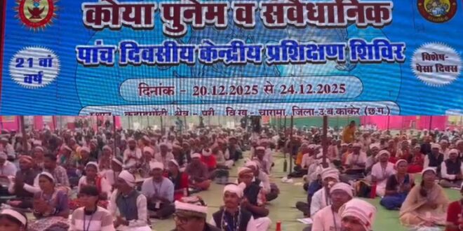 कांकेर 23 दिसंबर 2025 :- जिले के चारामा विकासखंड अंतर्गत पुरी क्षेत्र के ग्राम कहाड़गोंदी में आयोजित कोया पुनेम एवं संवैधानिक पाँच दिवसीय केंद्रीय प्रशिक्षण शिविर का आज चौथा दिन रहा। पेसा दिवस के अवसर पर आयोजित इस शिविर में देशभर से चयनित आदिवासी युवा-युवतियाँ सहभागिता कर रही हैं। प्रशिक्षण के चौथे दिन भी पेसा कानून, वन अधिकार मान्यता कानून, संवैधानिक अधिकार, ग्रामसभा सशक्तिकरण और आदिवासी स्वशासन प्रणाली से जुड़े विषयों पर सैद्धांतिक एवं व्यावहारिक प्रशिक्षण जारी रहा।