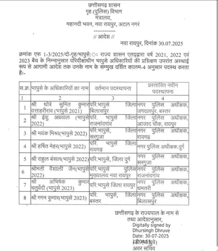 CG – IPS ट्रांसफर : आठ IPS अफसरों को मिली पोस्टिंग,राज्य सरकार ने किया आदेश जारी, देखें… Surya Nevendra 30/07/2025Was this article helpful?YesNo Follow Us Live Cricket Info
