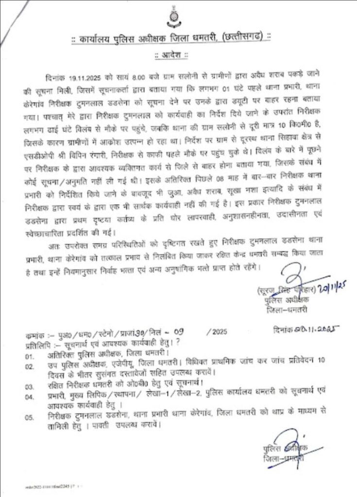 धमतरी, 22 नवम्बर 2025। धमतरी में एसपी ने थाना प्रभारी को निलंबित कर दिया है, इस संदर्भ में एसपी ने आदेश भी जारी कर दिया है, जिसके मुताबिक जिले के केरेगांव थाना क्षेत्र के ग्राम सलोनी में अवैध शराब पकड़ाए जाने की सूचना पर कार्रवाई में घोर लापरवाही बरतने के आरोप में केरेगांव थाना प्रभारी निरीक्षक टुमनलाल डडसेना को तत्काल प्रभाव से निलंबित कर रक्षित केन्द्र धमतरी भेज दिया गया है। यह कार्रवाई वरिष्ठ अधिकारियों द्वारा घटना की गंभीरता और निरीक्षक की उदासीनता को ध्यान में रखते हुए की गई।