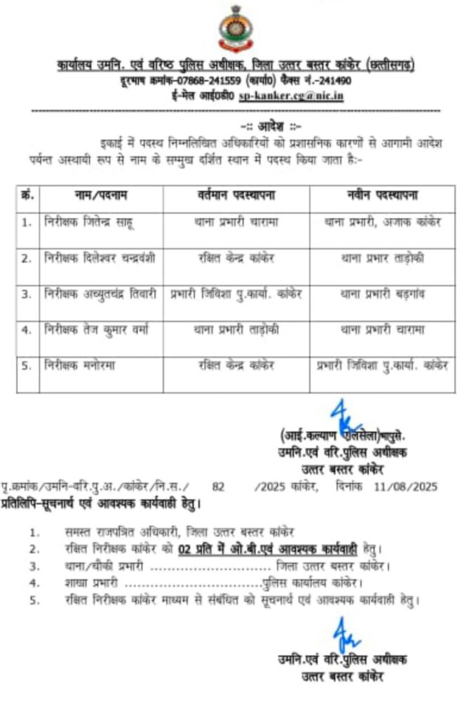 कांकेर 11 अगस्त 2025। चारामा थाना प्रभारी जितेंद्र साहू का तबादला कर दिया गया है। पुलिस महकमे में यह कार्रवाई उस घटना के बाद मानी जा रही है, जिसमें कुछ दिन पहले ट्रेलर चालक के साथ बेरहमी से मारपीट का वीडियो सोशल मीडिया पर वायरल हुआ था।