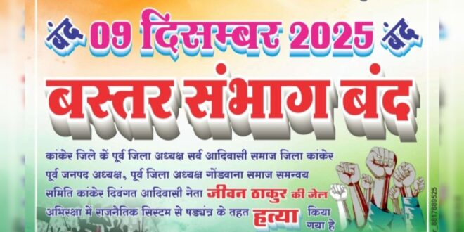 कांकेर 8 दिसंबर 2025:- आदिवासी समाज के  पूर्व जिला अध्यक्ष और कांग्रेस पार्टी के दिग्गज नेता दिवंगत जीवन ठाकुर की संदिग्ध मौत के बाद पूरे बस्तर संभाग में आक्रोश लगातार बढ़ता जा रहा है। समाज का कहना है कि जीवन ठाकुर की मौत सामान्य नहीं थी, बल्कि जेल में रहते हुए उनके साथ हुई लापरवाही और राजनीतिक साजिश का नतीजा है। इसी घटना को लेकर सर्व आदिवासी समाज बस्तर संभाग ने 09 दिसंबर 2025 को पूरे बस्तर संभाग में बंद का आह्वान किया है।