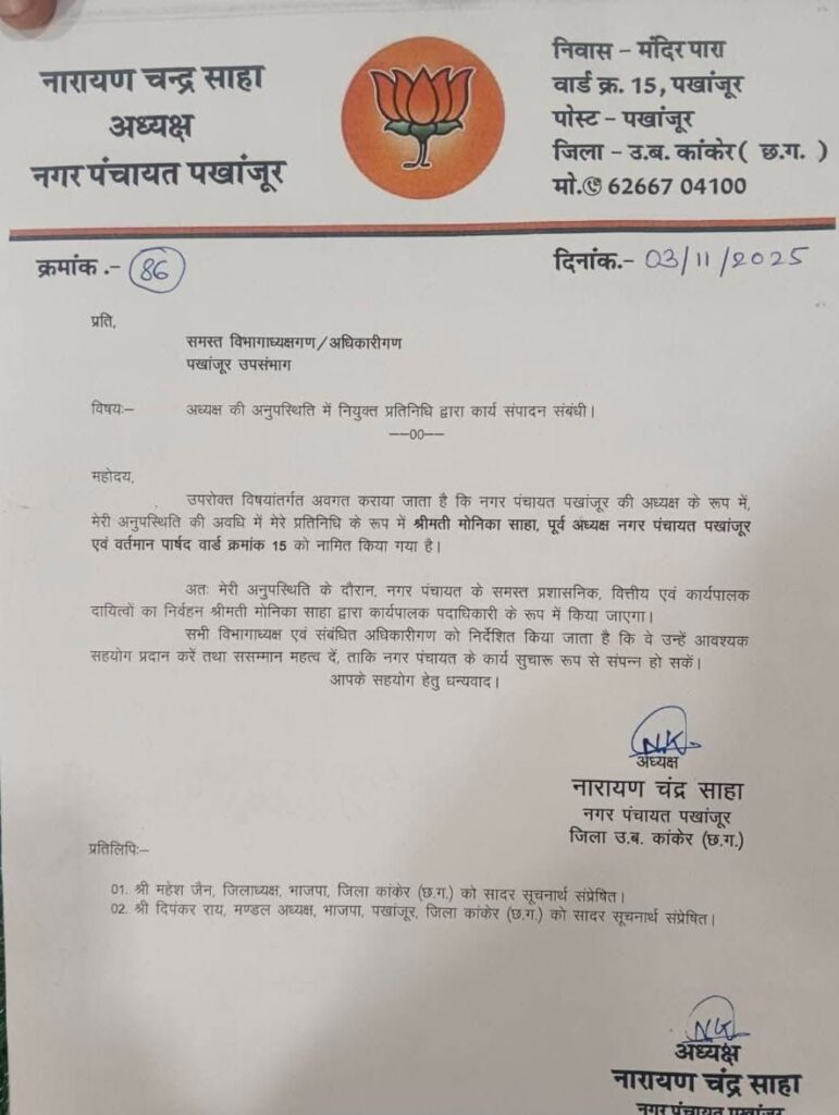 कांकेर 6 नवंबर 2025:- पखांजूर नगर पंचायत में एक अनोखा प्रशासनिक कारनामा सामने आया है। नगर पंचायत अध्यक्ष नारायण साहा ने अपनी अनुपस्थिति में अपनी ही पत्नी व वार्ड 15 की पार्षद मोनिका साहा को अध्यक्ष का कार्यभार सौंपने का पत्र जारी कर दिया। पत्र में न सिर्फ प्रशासनिक बल्कि वित्तीय अधिकार भी पत्नी को देने की बात दर्ज है। यह लेटर जारी होते ही नगर में इसकी जमकर चर्चा और मजाक उड़ने लगा, क्योंकि क़ानून में ऐसी कोई व्यवस्था है ही नहीं।