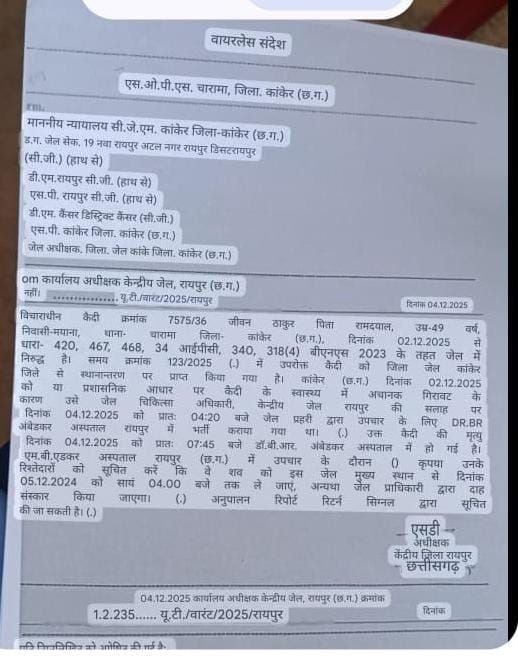 बताते चले कि जीवन ठाकुर को 12 अक्टूबर 2025 को एक मामले में गिरफ्तार कर जिला जेल कांकेर में रखा गया था। लेकिन 2 दिसंबर को उन्हें बिना किसी पूर्व सूचना के रायपुर सेंट्रल जेल भेज दिया गया। परिवार का कहना है कि न तो स्थानांतरण की जानकारी दी गई, न तबीयत बिगड़ने की और न ही अस्पताल में भर्ती कराए जाने की।