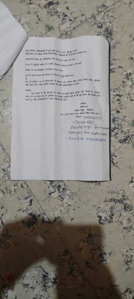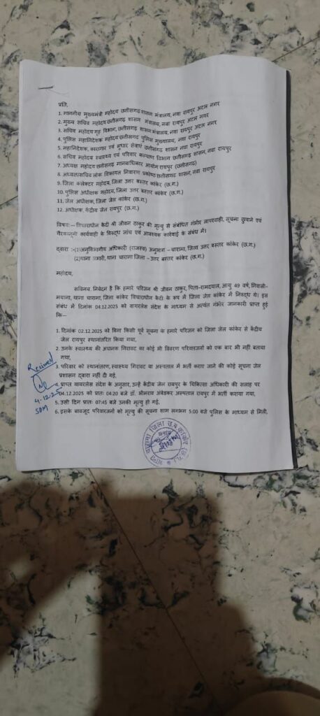 कांकेर, 4 दिसंबर 2025 – सर्व आदिवासी समाज के पूर्व जिला अध्यक्ष जीवन ठाकुर की रायपुर सेंट्रल जेल में संदिग्ध परिस्थितियों में हुई मौत के बाद आदिवासी समाज और परिवारजनों में भारी आक्रोश है। परिवार और समाजजनों ने जेल प्रशासन पर गंभीर लापरवाही, जानकारी छुपाने और हत्या का आरोप लगाते हुए आज थाना चारामा प्रभारी को ज्ञापन सौंपा।