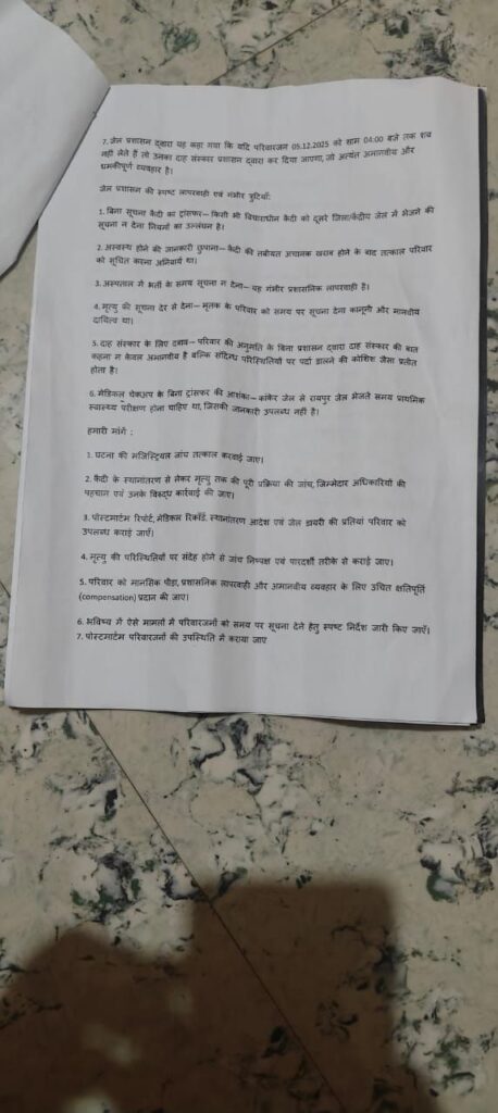 परिजनों और समाज ने ज्ञापन में पूरी घटना की मजिस्ट्रियल जांच, जिम्मेदार अधिकारियों पर कार्रवाई, मेडिकल रिकॉर्ड और पोस्टमार्टम रिपोर्ट उपलब्ध कराने, पोस्टमार्टम परिवार की उपस्थिति में कराने और परिवार को क्षतिपूर्ति देने की मांग की है। साथ ही शव को सुरक्षित ग्राम लाकर परिवार को सौंपने की भी मांग की गई है। इस दौरान बड़ी संख्या में समाज के लोग उपस्थित रहें।
